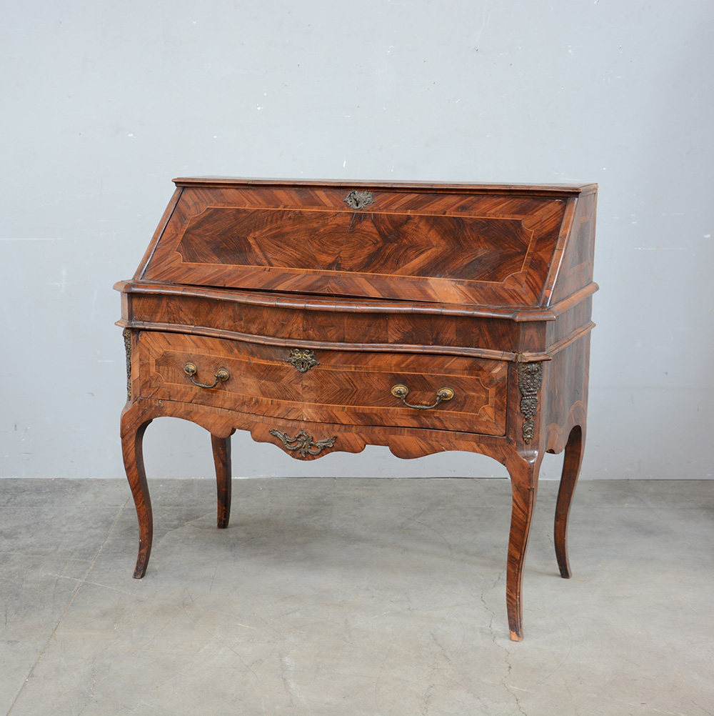 Ribalta lastronata e filettata in radica e palissandro con fronte sagomato ad un cassetto e anta ribaltabile celante cassetti, vano e cassetto segreto. Gambe mosse. (cm 120x106x58)