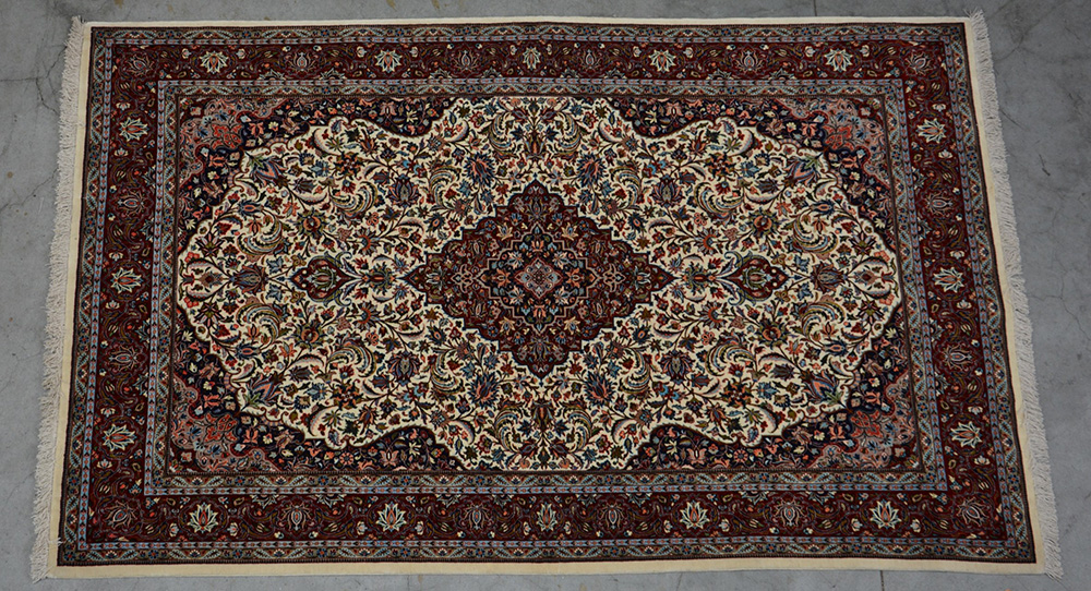 [Tappeto] Tappeto Keshan. Persia, sec. XX. Disegno a medaglione rosso su campo bianco decorato a motivi floreali annodato in lana e seta (cm 211x135)(difetti)