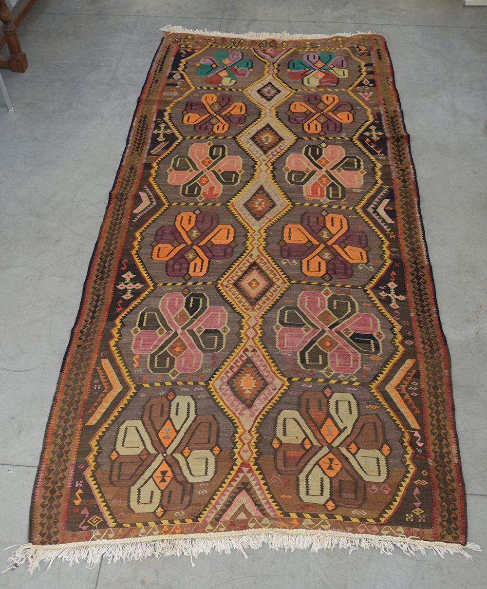 [Tappeti] Tappeto Kilm Karabagh, Caucaso, prima metà sec. XX. Disegno a medaglioni di ispirazione arcaica greca nei toni del beige, arancio, bordeaux e rosa su fondo marrone. Ordito in cotone (cm 354x174)(difetti e restauri)