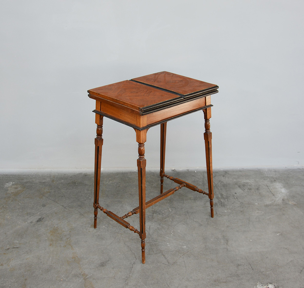 Tavolino da lavoro a quattro gambe riunite da traversa con filettature ebanizzate, piano apribile celante scomparti (cm 48x73x37)(difetti)