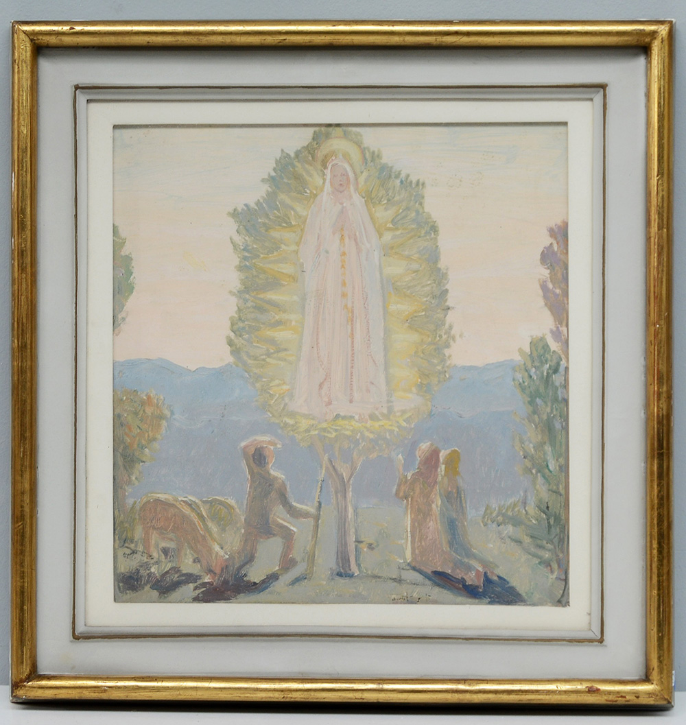 Firma indecifrata "L'apparizione" olio su cartone (cm 36x34) firmato in basso sulla destra, in cornice