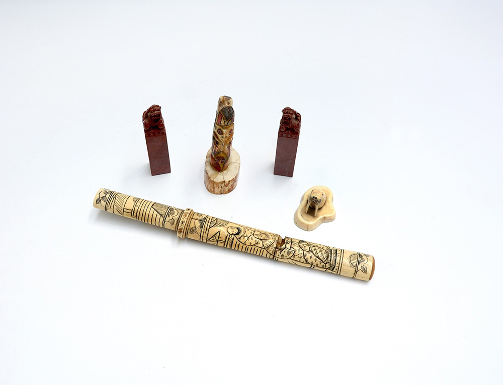Lotto vario composto da un pugnale con manico e custodia in osso inciso, due sculturine raffiguranti una foca e un totem e due sigilli in pietra dura (difetti)