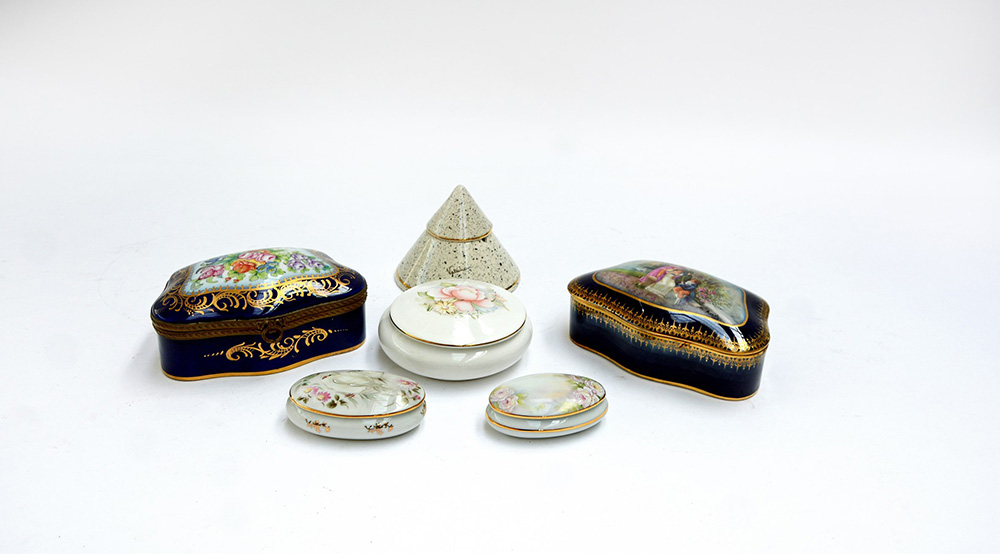 Lotto di sei cofanetti in ceramica decorati in policromia, manifatture differenti fra cui Limoges (difetti)