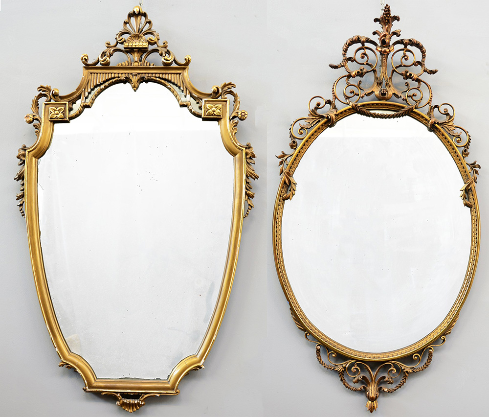 Lotto di due specchiere di forma sagomata in legno intagliato e dorato, misure diverse (difetti)