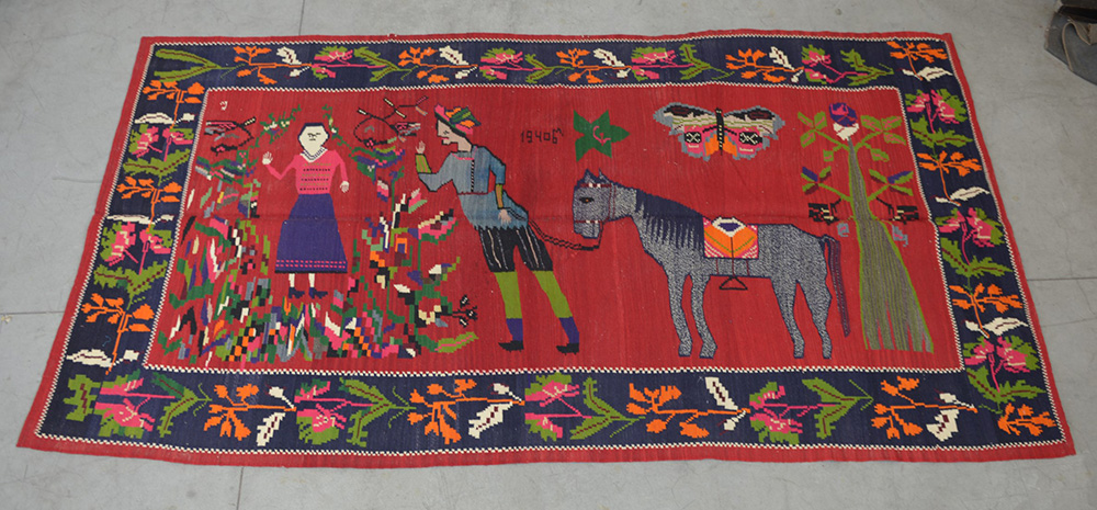 [Tappeti] Tappeto Kilim, Bessarabia, prima meta sec. XX. Disegno pittorico con dama, cavaliere e cavallo policromi su fondo rosso. Bordura con tralci di vite su fondo blu notte (cm 280x152)(difetti)