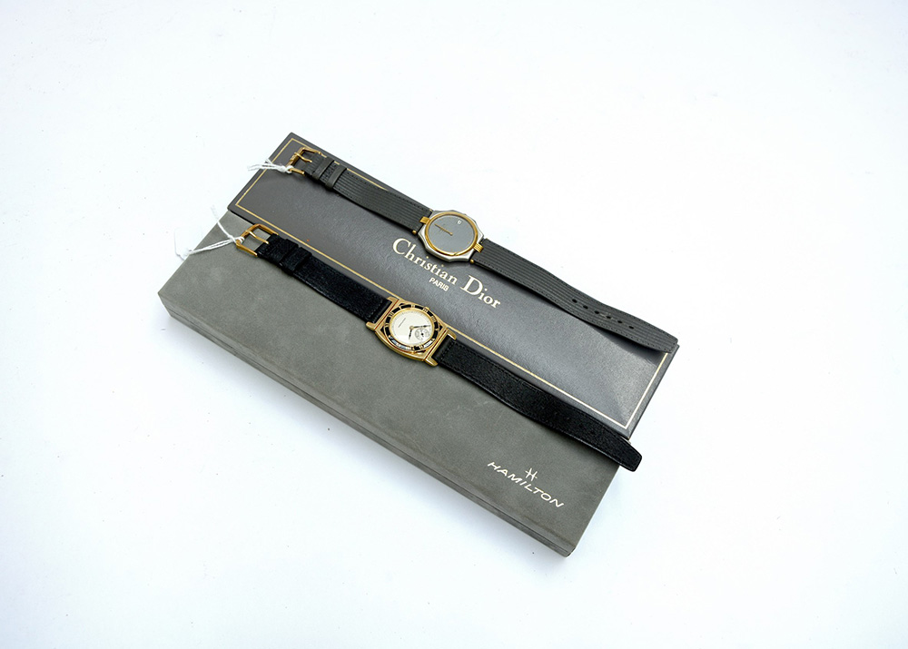 Lotto di due orologi da polso per signora con movimento al quarzo, marcati Christian Dior e Hamilton, bracciale con chiusura a dardiglione, in custodie originali (lievi difetti)