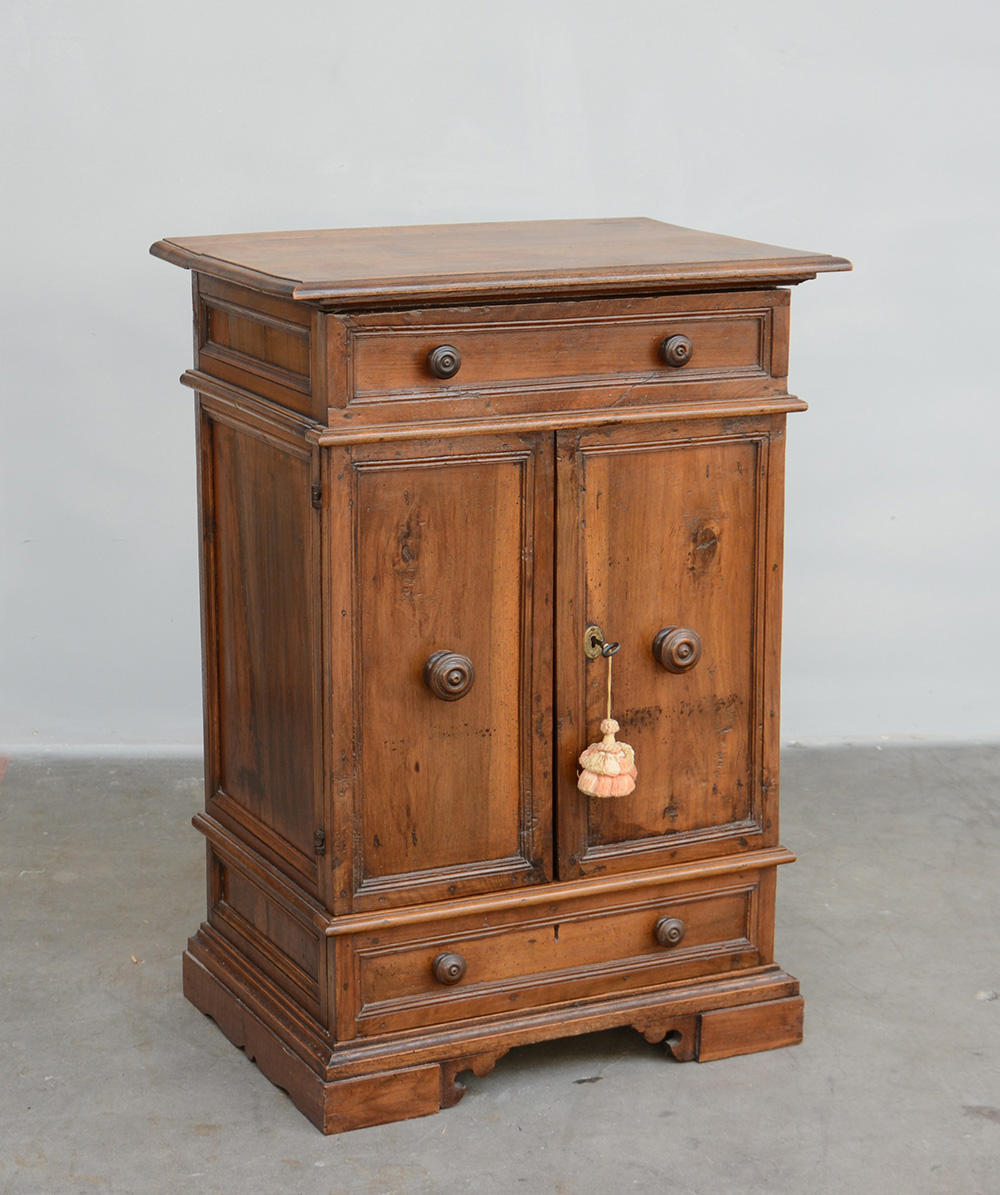 Credenzino in noce a due cassetti e due antine riquadrate sul fronte, piedi a mensola (cm 70x98x47)
