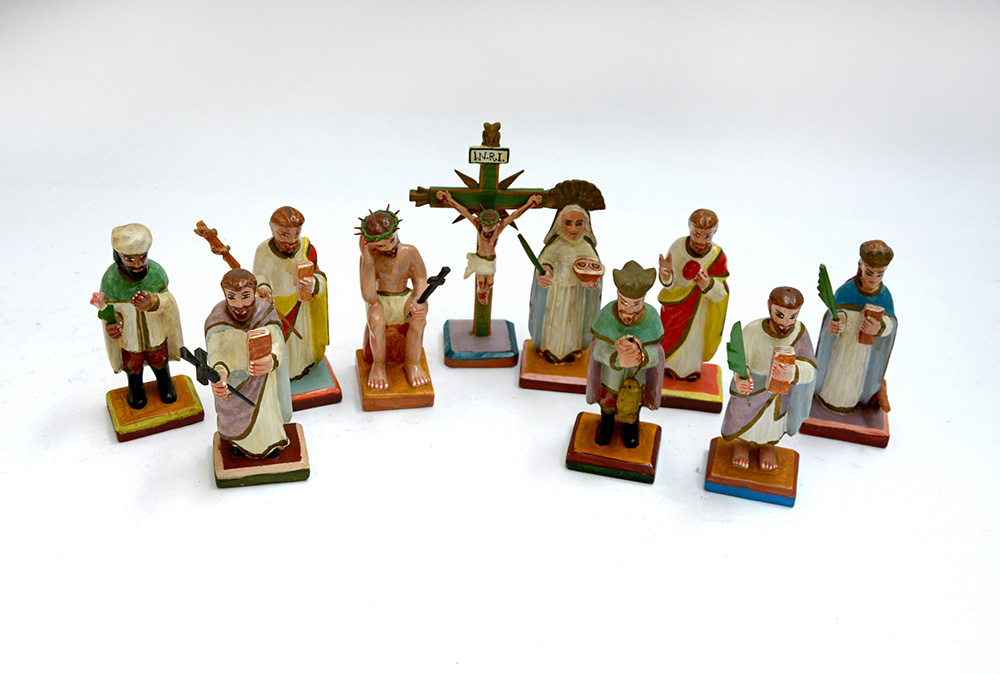 Lotto composto da dieci sculturine in legno intagliato e dipinto raffiguranti figure religiose (h max cm 17.5)(difetti)