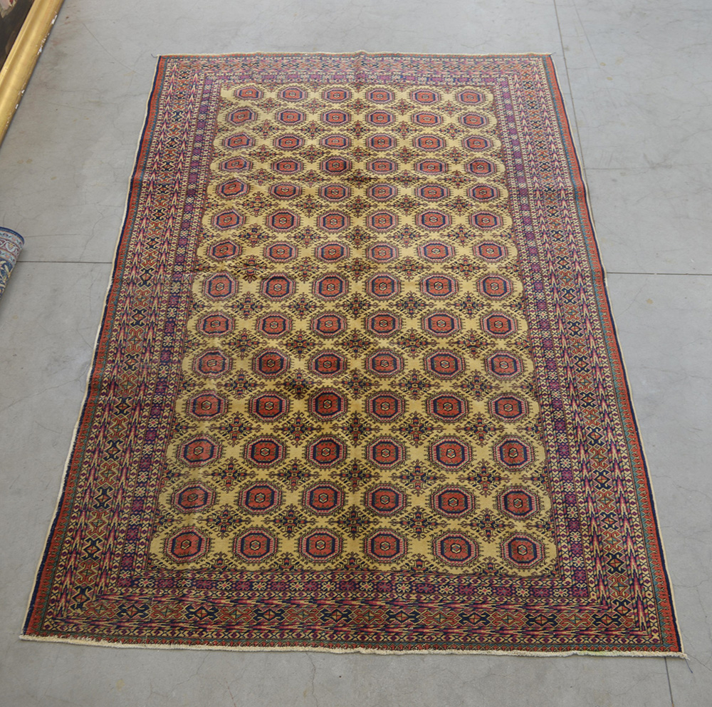 [Tappeto] Tappeto Kaisery, Anatolia, prima metà sec. XX. Disegno Bhoukara Kerki con file geometriche di Gull nei toni del blu, verde e arancio su fondo bianco (cm 293x200)(difetti e mancanze)