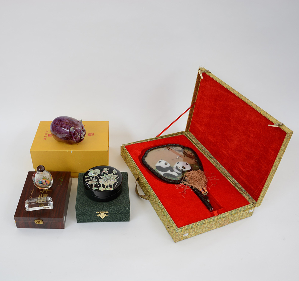 Manifattura di Cina. Lotto composto da un ventaglio in legno e stoffa, una scultura raffigurante maiale in porcellana, una snuff bottle in vetro ed una scatola con coperchio in lacca, in custodie