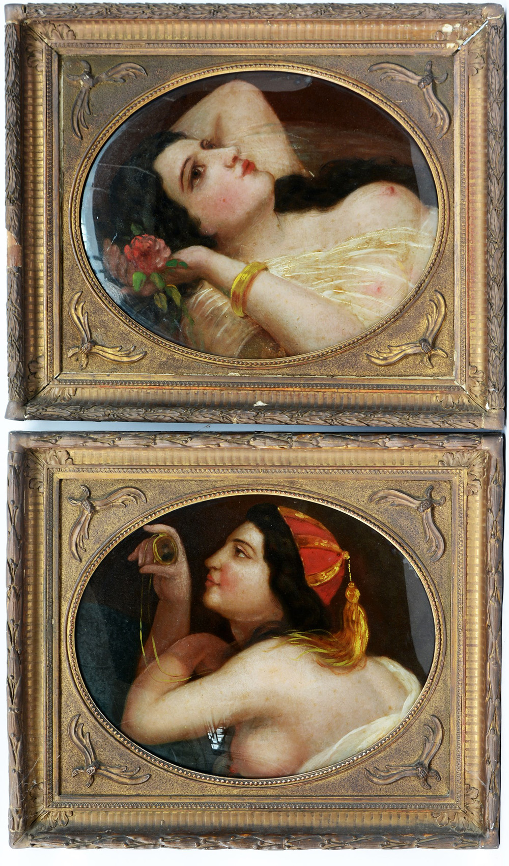 Ignoto del sec. XIX "Odalische" coppia di dipinti ad olio su tela ovale applicata su vetro (cm 28x46) in cornici (difetti)