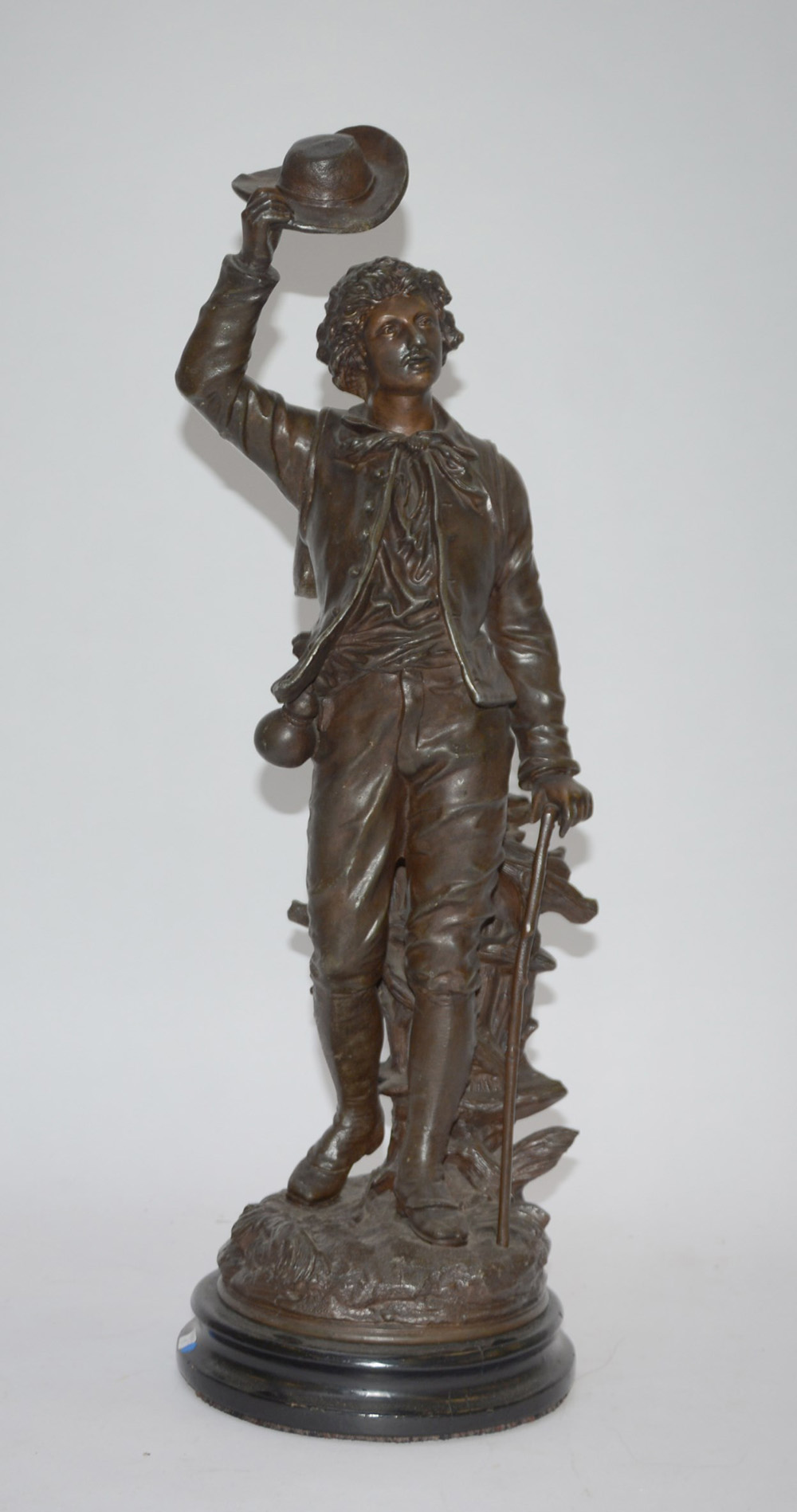 Firma indecifrata, "Il saluto", scultura in antimonio tinto color bronzo su base in legno, firmata alla base, inizio sec. XX (h tot cm 60) (lievi difetti)