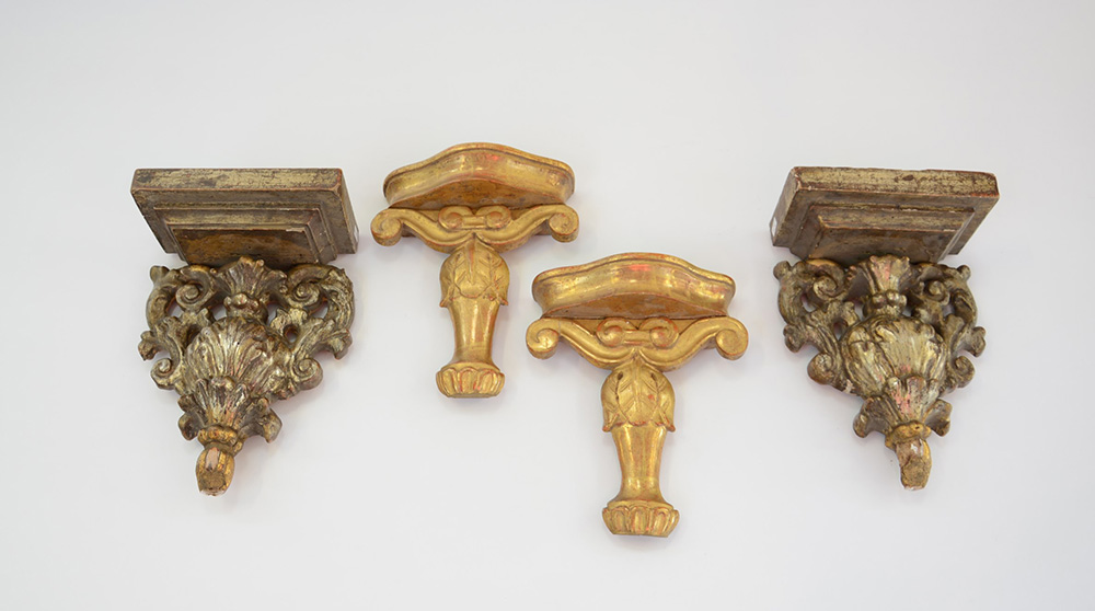 Lotto composto da due coppie di mensoline del sec. XIX in legno intagliato e dorato (difetti)