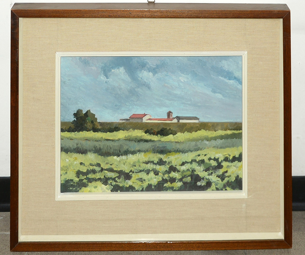 A. Da Rios "Campagna lodigiana" 1959, olio su compensato (cm 26x35) firmato, datato e titolato al verso. In cornice