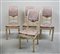 Gruppo di quattro sedie in legno intagliato e laccato con piccoli fregi...