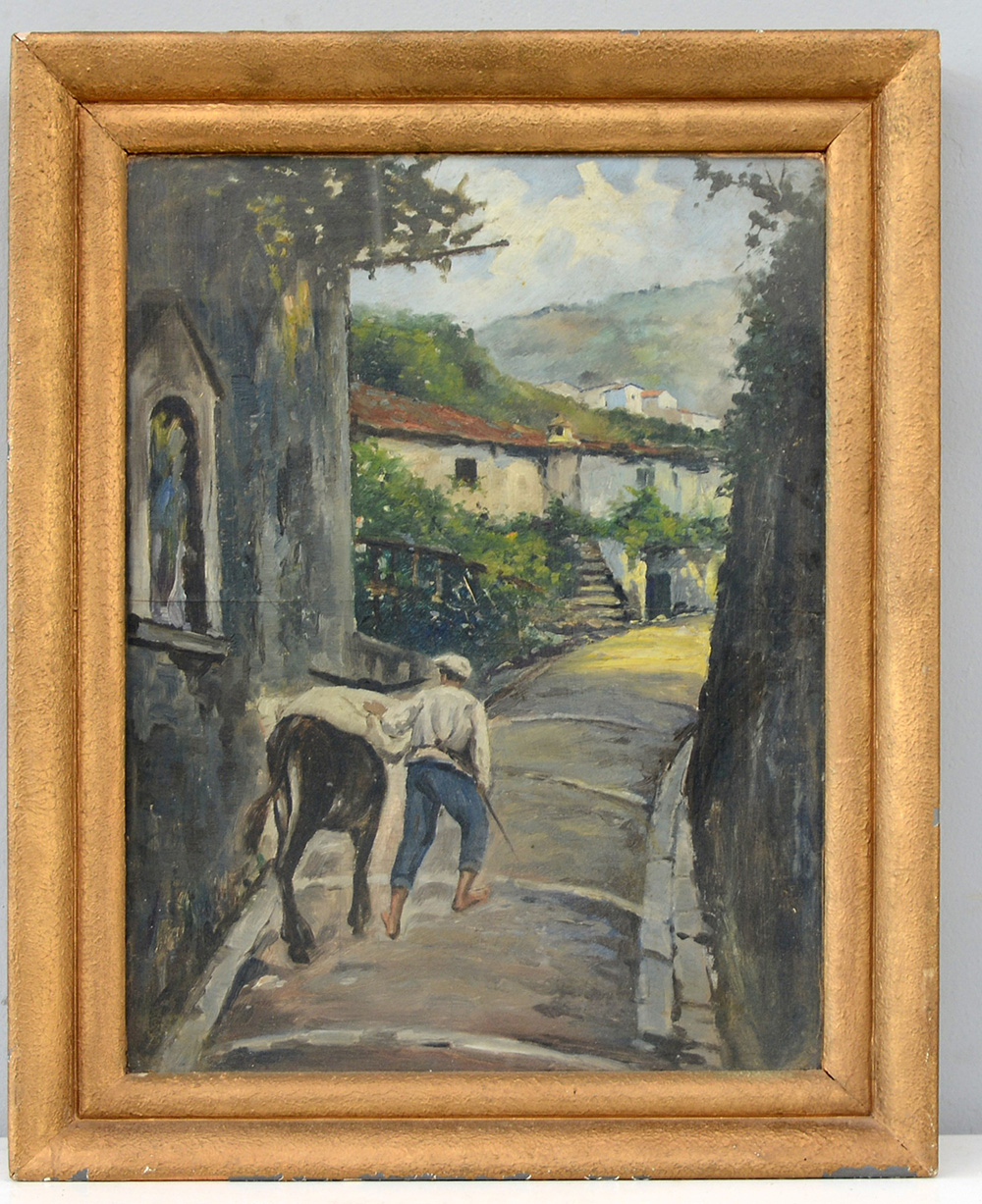 Ignoto "Uomo con mulo" olio su compensato (cm 37x50) in cornice (difetti)