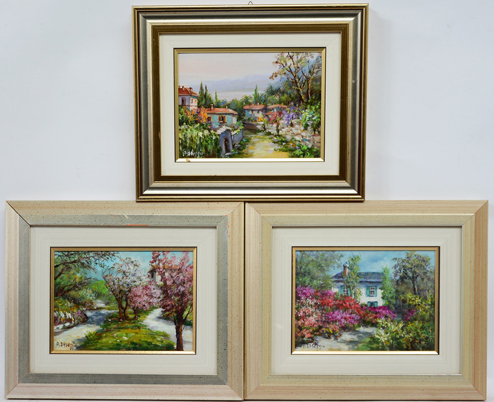 Albina Agosta Baseggio Lotto di tre dipinti ad olio su tela raffiguranti paesaggi fioriti, in cornici