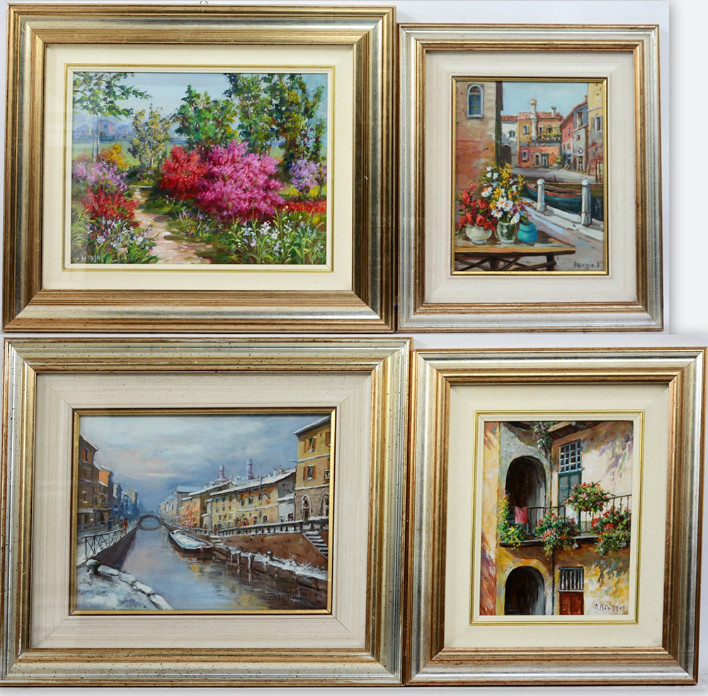 Albina Agosta Baseggio Lotto di quattro dipinti ad olio su tela raffiguranti paesaggi e scorci di città, misure diverse, in cornici