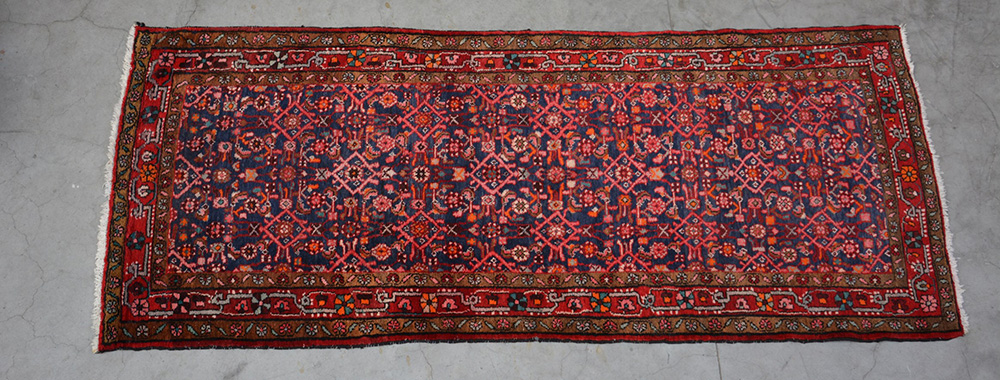 [Tappeto] Tappeto Mossul. Persia, sec. XX. Disegno Herati nei toni del rosa, arancio e verde su campo blu (cm 291x121)(difetti)
