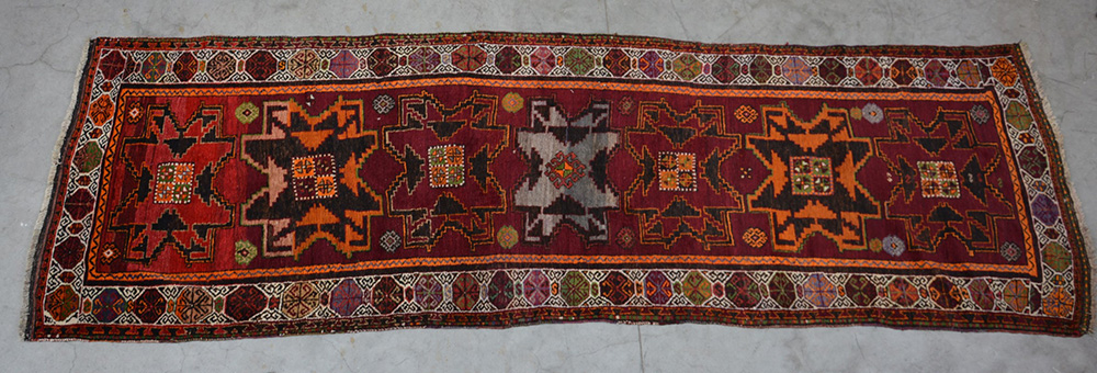 [Tappeto] Tappeto Van. Anatolia, sec. XX. Disegno Lesghi nei toni dellarancio, verde, azzurro e marrone su campo rosso (385x121cm) (difetti)