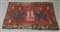 [Tappeti] Tappeto Kilim, Bessarabia, sec. XX. Decoro pittorico con due militari a cavallo e due giovani su fondo rosso. Bordura a tralci di vite su fondo marrone (cm (237x149)(difetti e restauri)