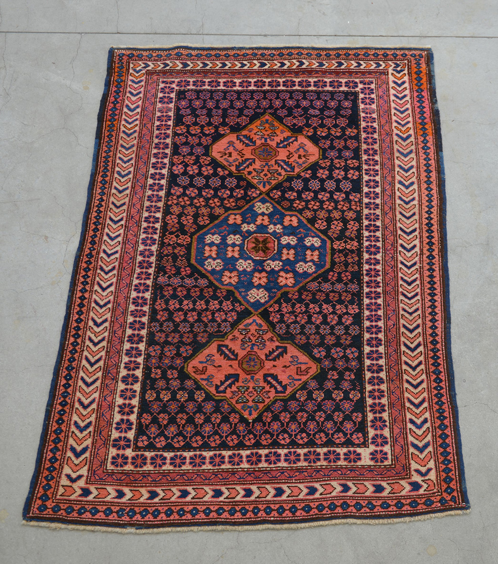 [Tappeti] Tappeto Daghestan, Caucaso, prima metà sec XX. Disegno con medaglione azzurro e due puntali rosa su campo blu notte cosparso di fiori. Molteplici bordure nei toni del bianco, rosa e azzurro (cm 160x109) (restauri)