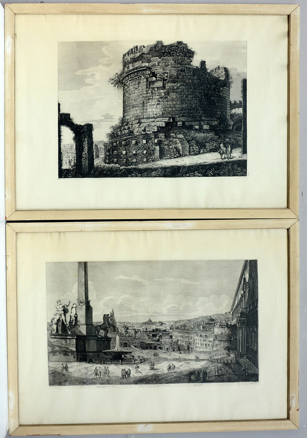 Coppia di riproduzioni dall'opera di Luigi Rossini: "Veduta del Gran Sepolcro di Cecilia Metella" e "Veduta generale del Monte Quirinale", tratte dalla serie delle vedute di Antichità Romane (cm 65x90), in cornici (difetti)
