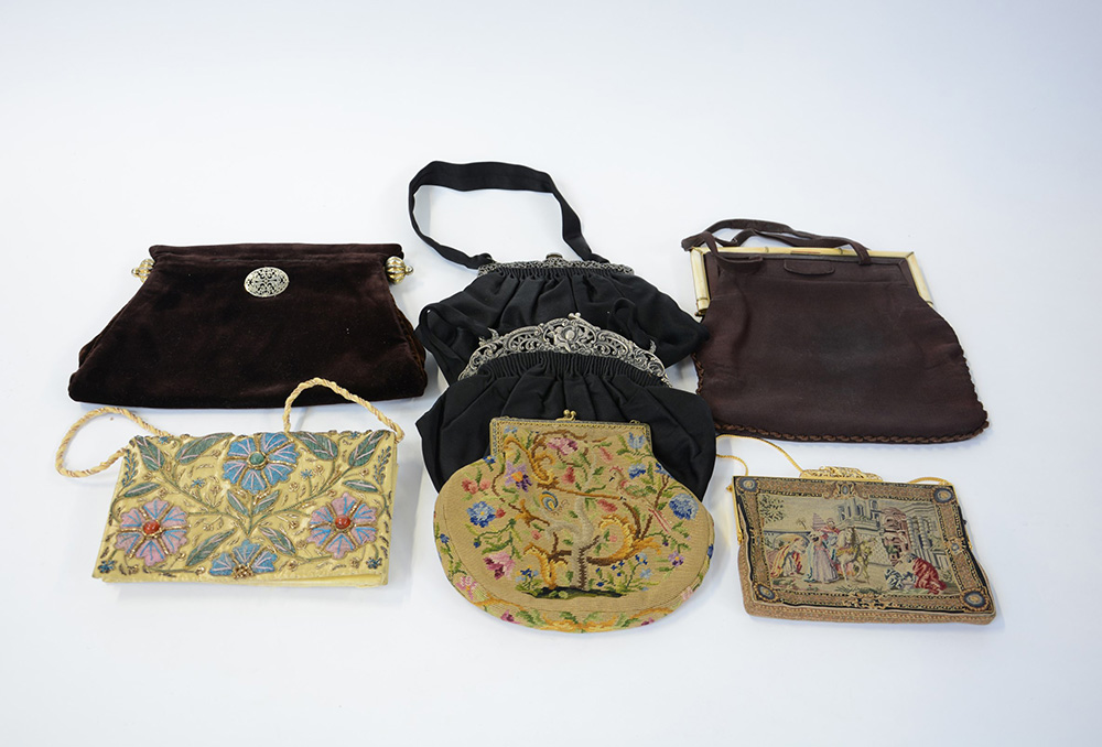 Lotto composto da sette borsette da donna di forma e foggie diverse (difetti)
