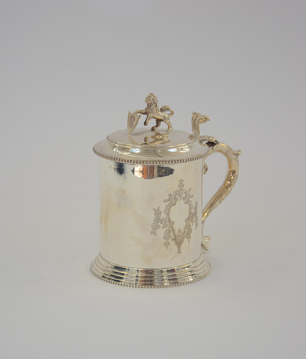 Boccale con coperchio in sheffield decorato con cartigli, pesa a forma di leone reggistemma (h cm 21)