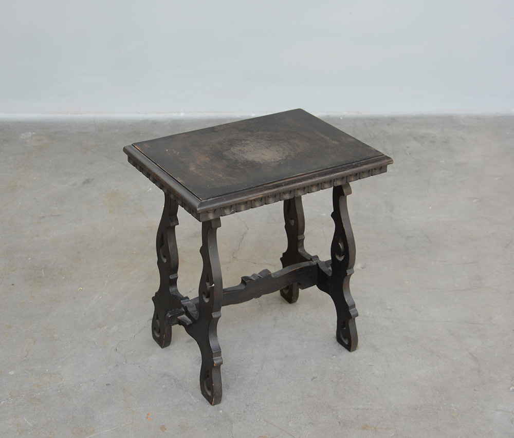 Tavolino in legno ebanizzato con montanti sagomati, inizio sec XX(cm 46x50x35)(difetti)