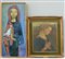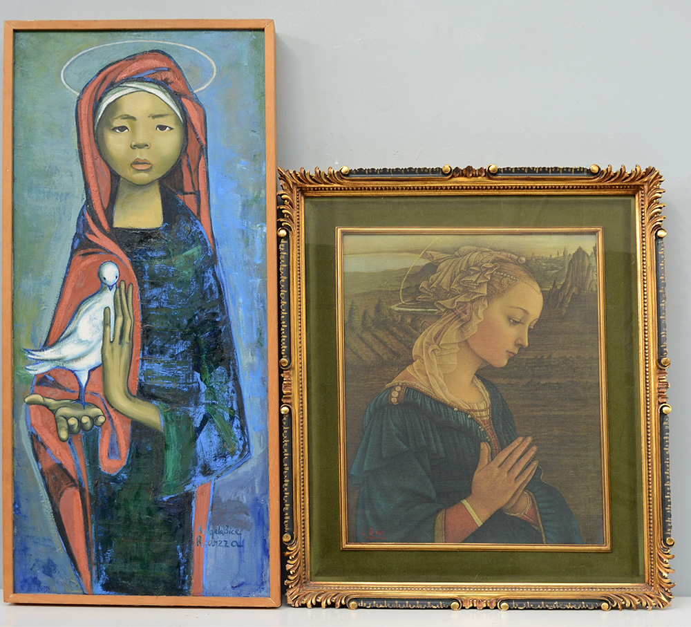 Lotto composto da un dipinto ad olio raffigurante una santa con colomba, e una riproduzione della Madonna del Botticelli, misure differenti, in cornici (difetti)