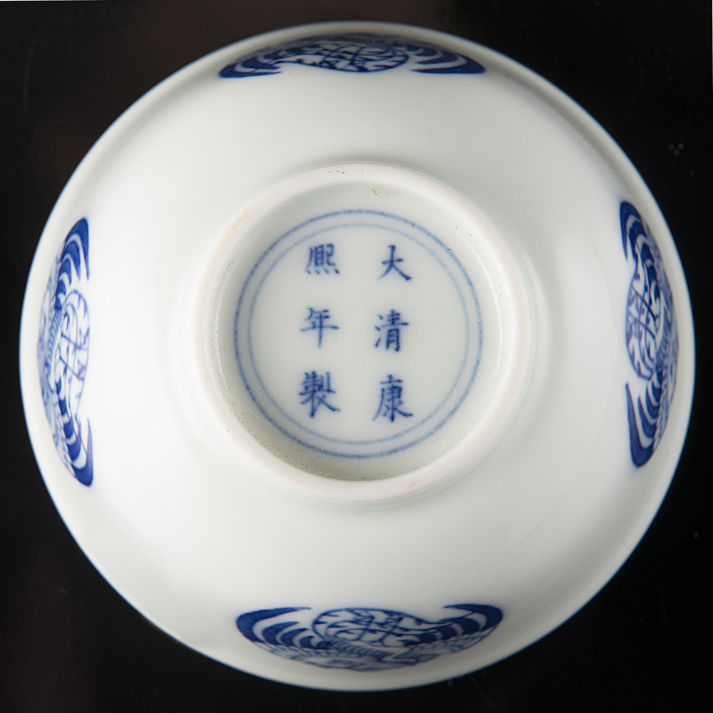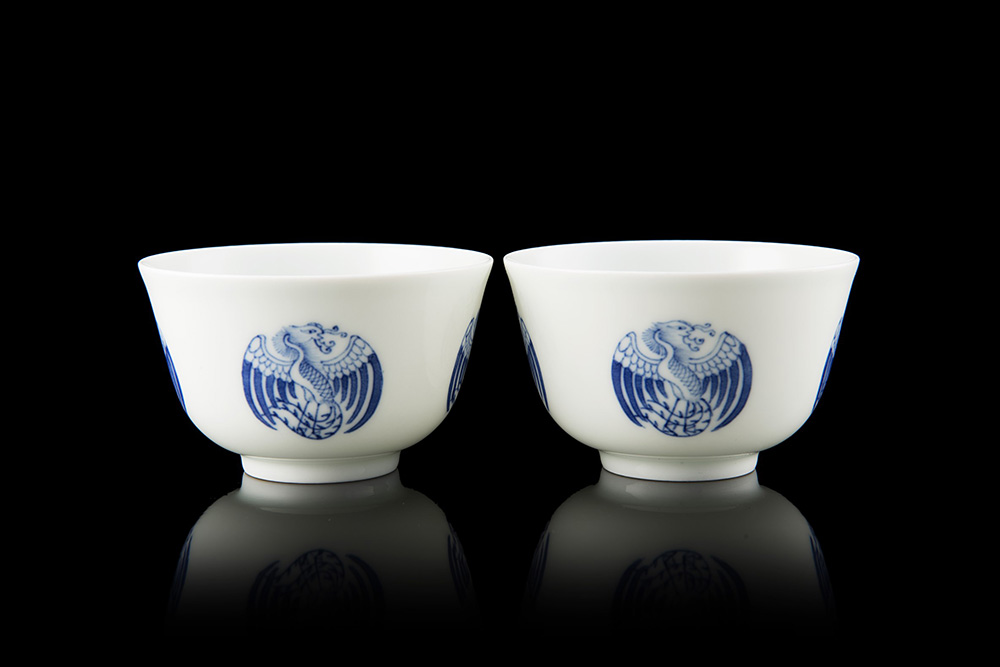 Coppia di coppette in porcellana bianca e blu con decorazione di fenici, con marchio apocrifo Kangxi sul fondo, in scatola originale Cina, sec. XX (h. 7,5 cm.) -EN A pair of small blue and white porcelain cups, each enamelled with phoenix roundels, with apocryphal Kangxi mark to the base, with box China, 20th Century (h. 7,5 cm.)