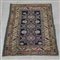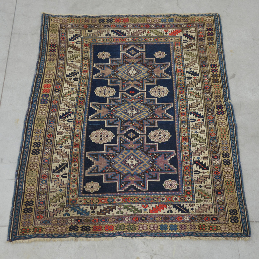 [Tappeti] Tappeto Shirwan Lesghi, Caucaso, inizio sec. XX. Disegno con tre medaglioni a croce greca nei toni del violetto, beige e marrone su fondo blu scuro. Bordura principale con foglie dentate e calici (cm 154x116) (difetti e restauri)