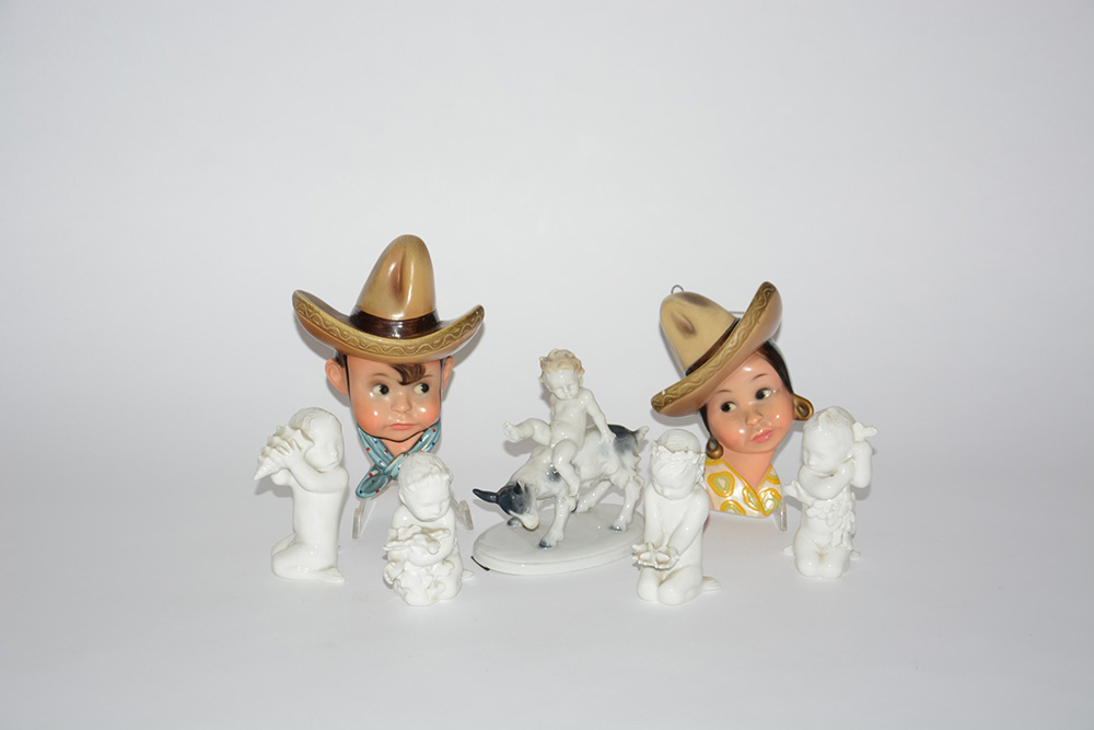 Manifatture diverse del sec. XX, lotto di sette sculturine in porcellana e ceramica raffiguranti putti e volti (difetti)