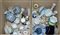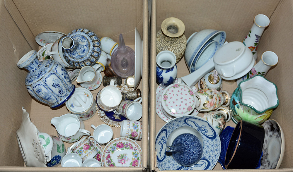 Lotto di due cartoni contenenti parti di servizi e oggetti per la tavola in ceramica, manifatture differenti (difetti)