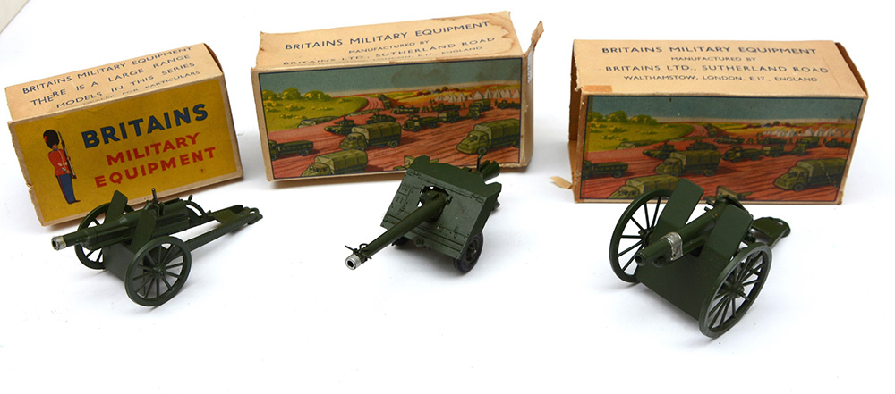 Lotto di tre modelli di cannone in metallo, manifattura W. Britain, in custodie originali