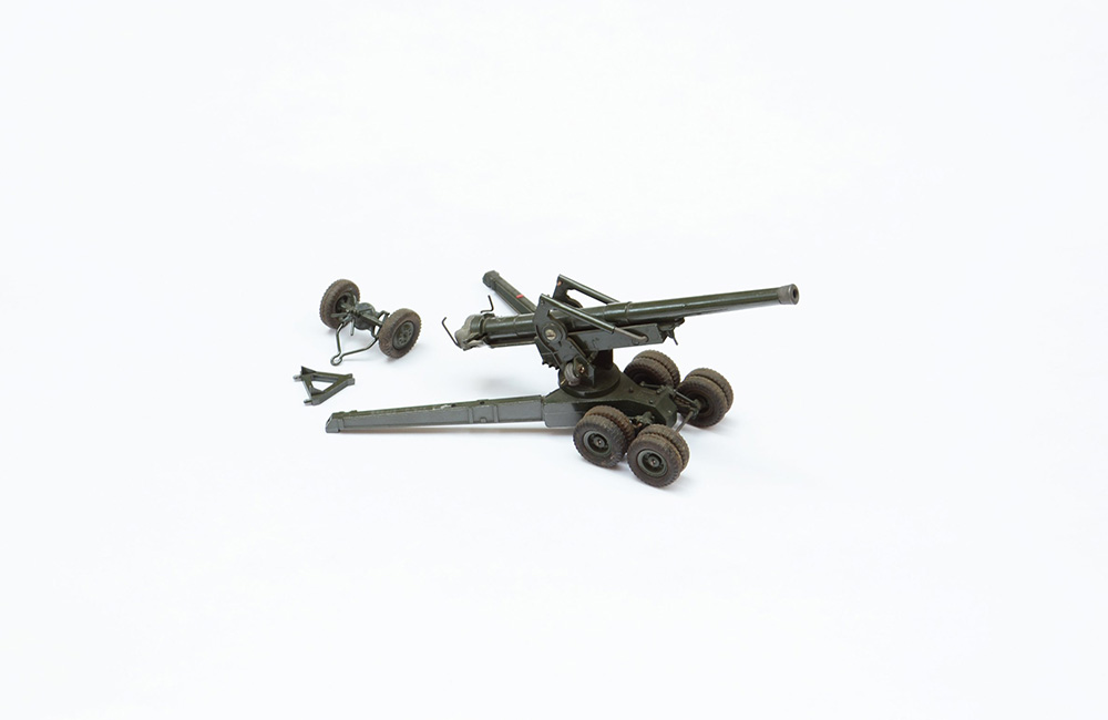 Grande modello di cannone da 105 mm a fusto di ruote per trasporto, completo di accessori, manifattura W. Britain