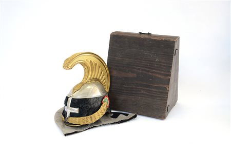Elmo da ufficiale del reggimento Genova Cavalleria del Regno d'Italia, corredato da telino e scatola da trasporto, 1930 ca. (difetti e mancanze)