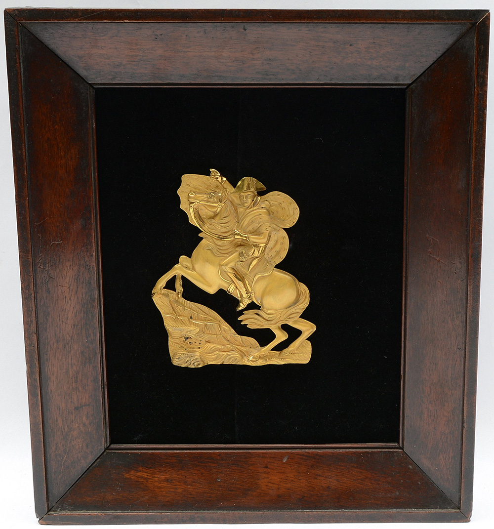 Rilievo in bronzo dorato al mercurio, raffigurante Napoleone al passaggio delle Alpi, fine secolo XIX, in cornice (difetti)