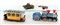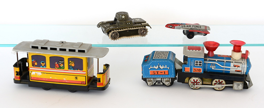 Lotto di quattro giocattoli a molla in latta dipinta: una locomotiva, un tram, un aeroplanino e un piccolo carro armato (mancanze) -EN Lotto di quattro giocattoli a molla in latta dipinta: una locomotiva, un tram, un aeroplanino e un piccolo carro armato (mancanze)