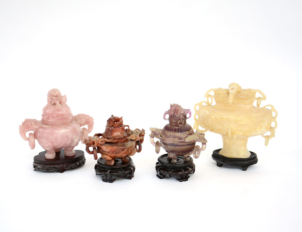 Lotto di quattro incensieri con coperchio di manifattura e misure diverse, con basi in legno (difetti) Cina sec. XX