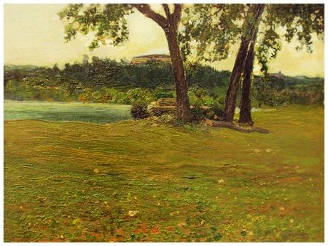 CARLO PASSIGLI 1881 - 1953 Campagna veneta Olio su tavola 26 x 36. Firma in b. a d.; sul verso 2 timbri Porto Dazio, Milano.