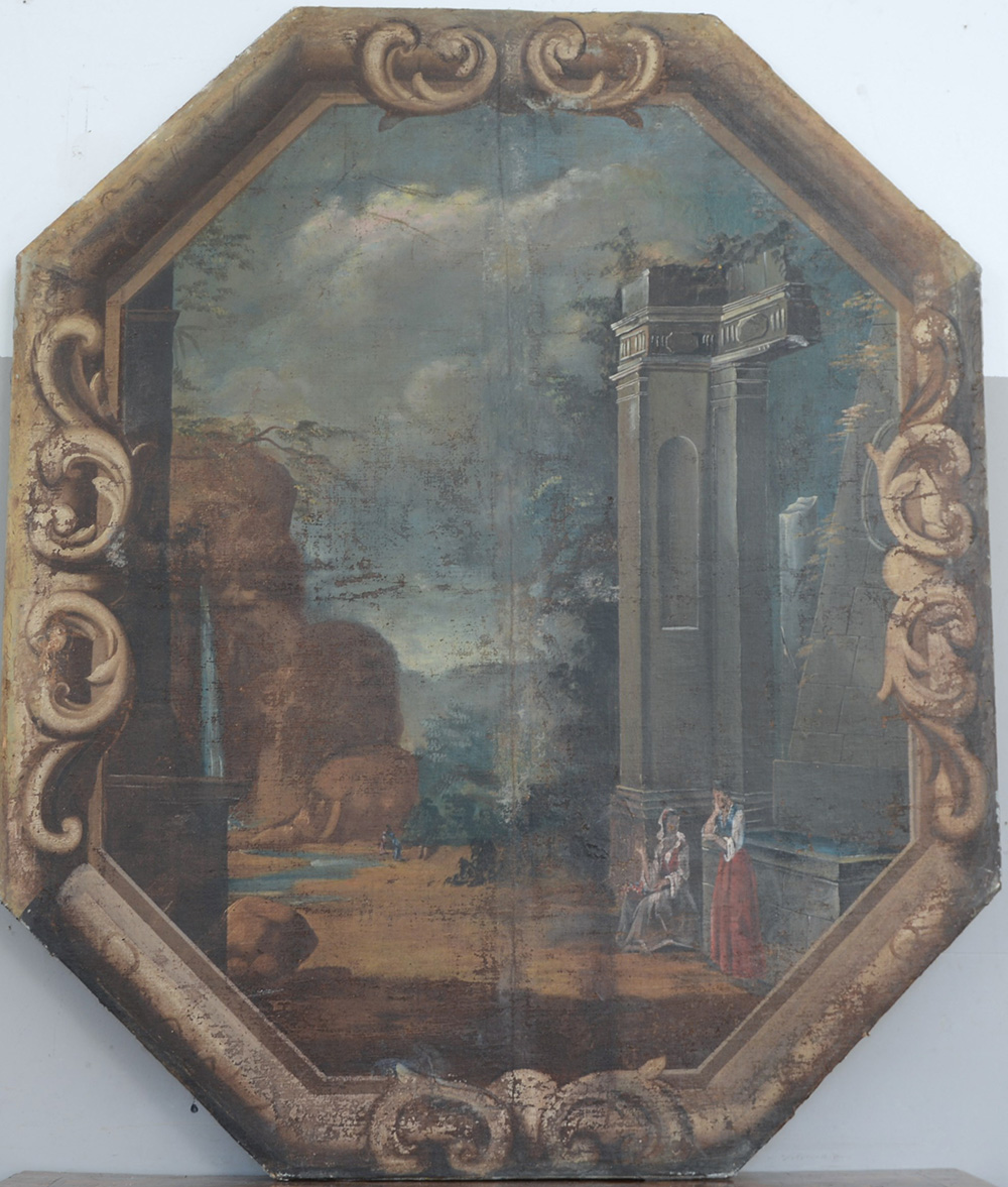 Scuola veneta secolo XVIII "Viandanti tra rovine" olio su tela (cm 160x132) (difetti e restauri)