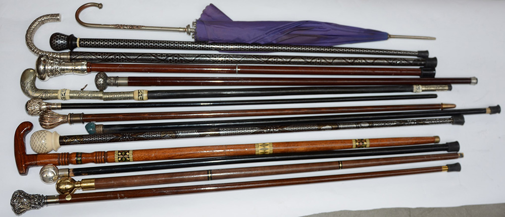 Collezione di tredici bastoni ed un ombrellino in legno, osso e metallo argentato (difetti)