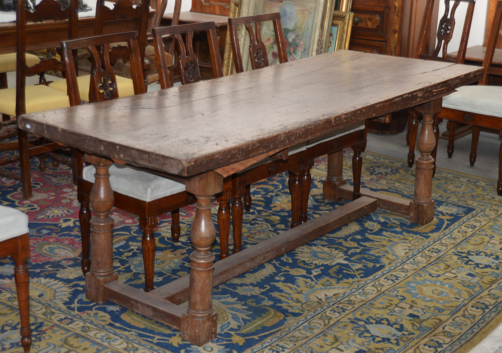 Tavolo da pranzo con piano rettangolare, gambe tornite riunite da traverse piatte ( cm 200x71x78)(mobile costruito con legno vecchi, difetti)