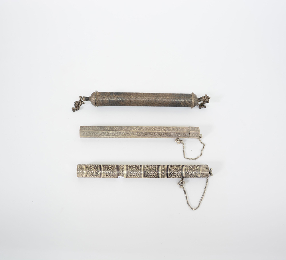 Lotto composto da tre porta preghiera in argento di forma cilindrica di diverso decoro (lungh. max cm 25) (gr 280 ca.) (difetti)