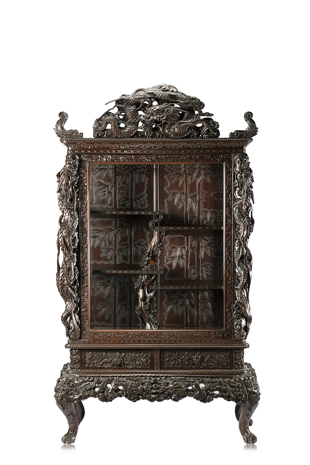 Grande mobile in legno riccamente intagliato con draghi e motivi floreali, l’interno con mensole asimmetriche, anta in vetro, con due cassetti (difetti e mancanze) Giappone, periodo Meiji (1868-1912) (212x120x53 cm.) -EN A large dark wood cabinet richly decorated with dragons and floral motifs, the interior with asymmetric shelves, glazed door and two drawers (losses) Japan, Meiji period (1868-1912) (212x120x53 cm.)