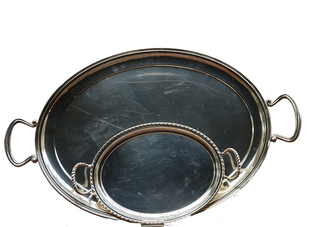 Lotto composto da due vassoi a due manici di forma ovale in metallo (cm 37x23; cm 68x40) (lievi difetti)