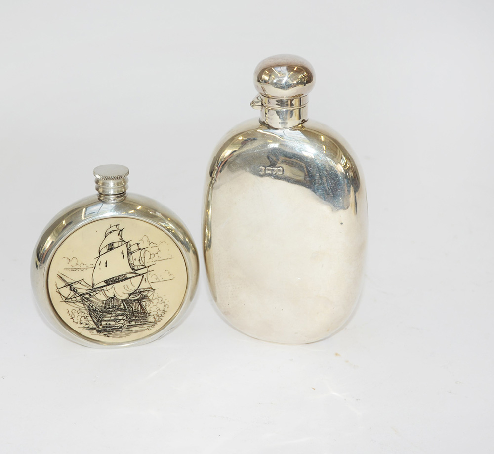 Lotto composto da due fiaschette, una in argento Londra, 1907 e l'altra in metallo (h. cm 16,5) (gr 180 ca.)(difetti)