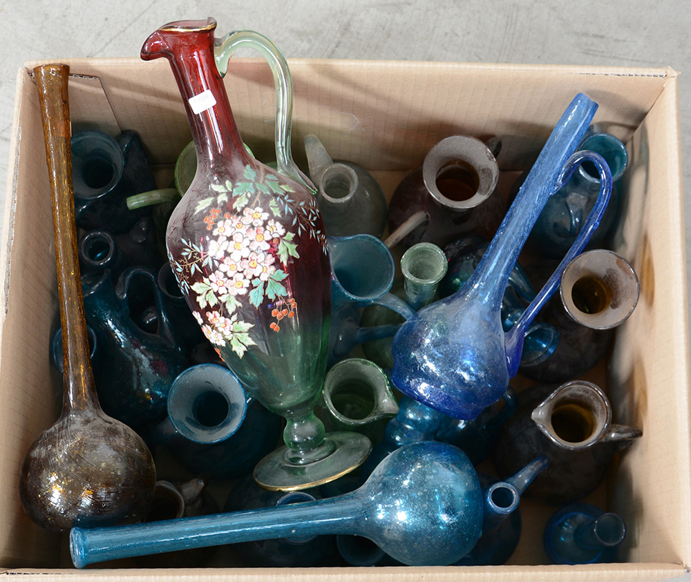 Collezione di numerose bottigliette a collo lungo, versatoi e ampolle in vetro di manifatture e decori diversi (difetti)